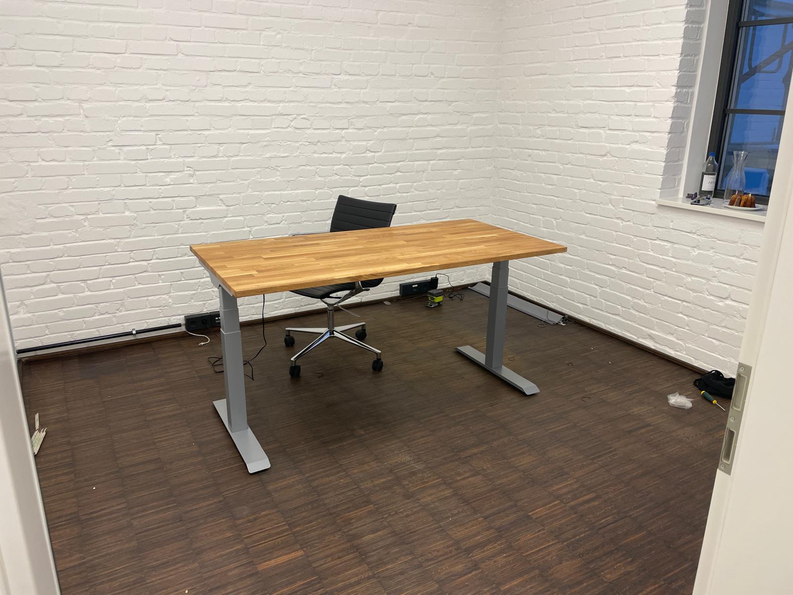 Frau F. hat ihr neues Büro mit 11 Schreibtischen ausgestattet – alle mit grauem Gestell und massiver Eichenholzplatte. Hier sehen Sie eines dieser stilvollen Exemplare.