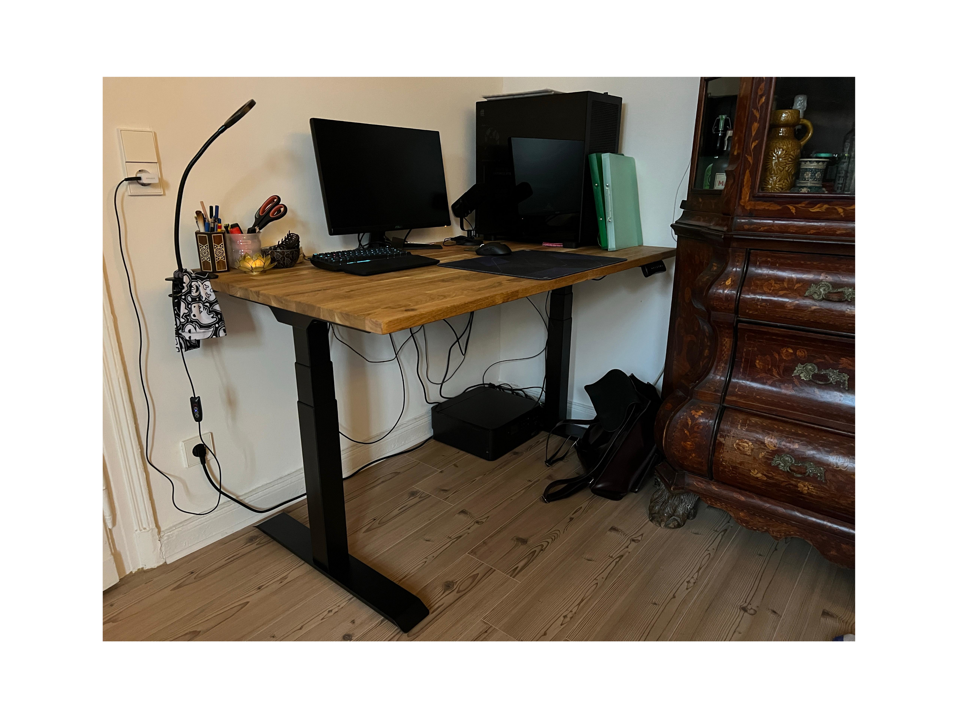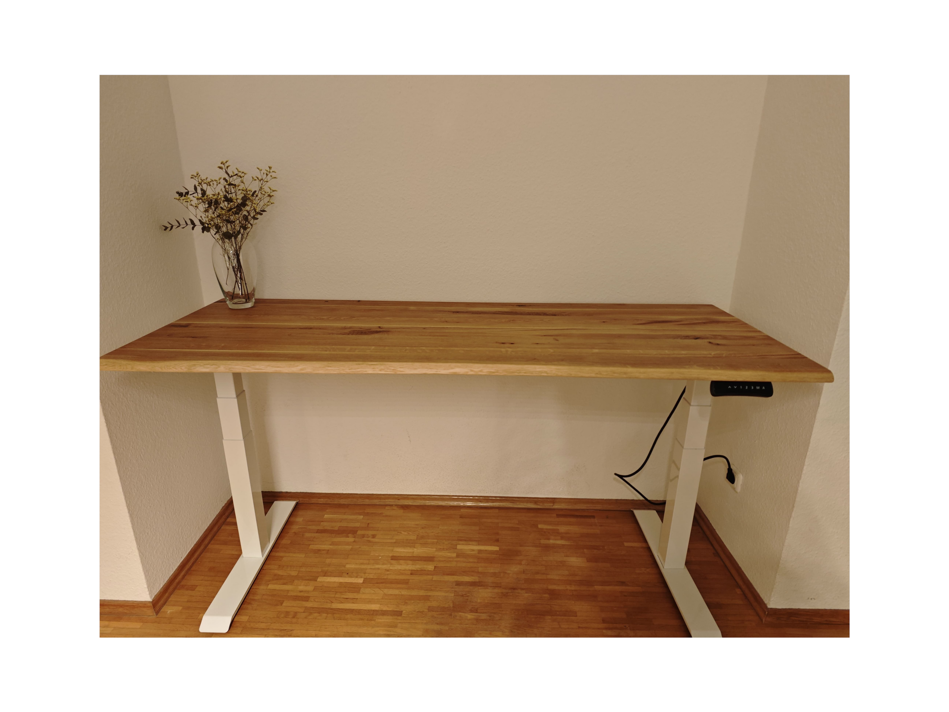 Unser Kunde, Herr S., hat seinen Schreibtisch perfekt in den Raum integriert. Das weiße Gestell setzt einen modernen Akzent und bildet einen harmonischen Kontrast zum Eichenholz mit Baumkante.