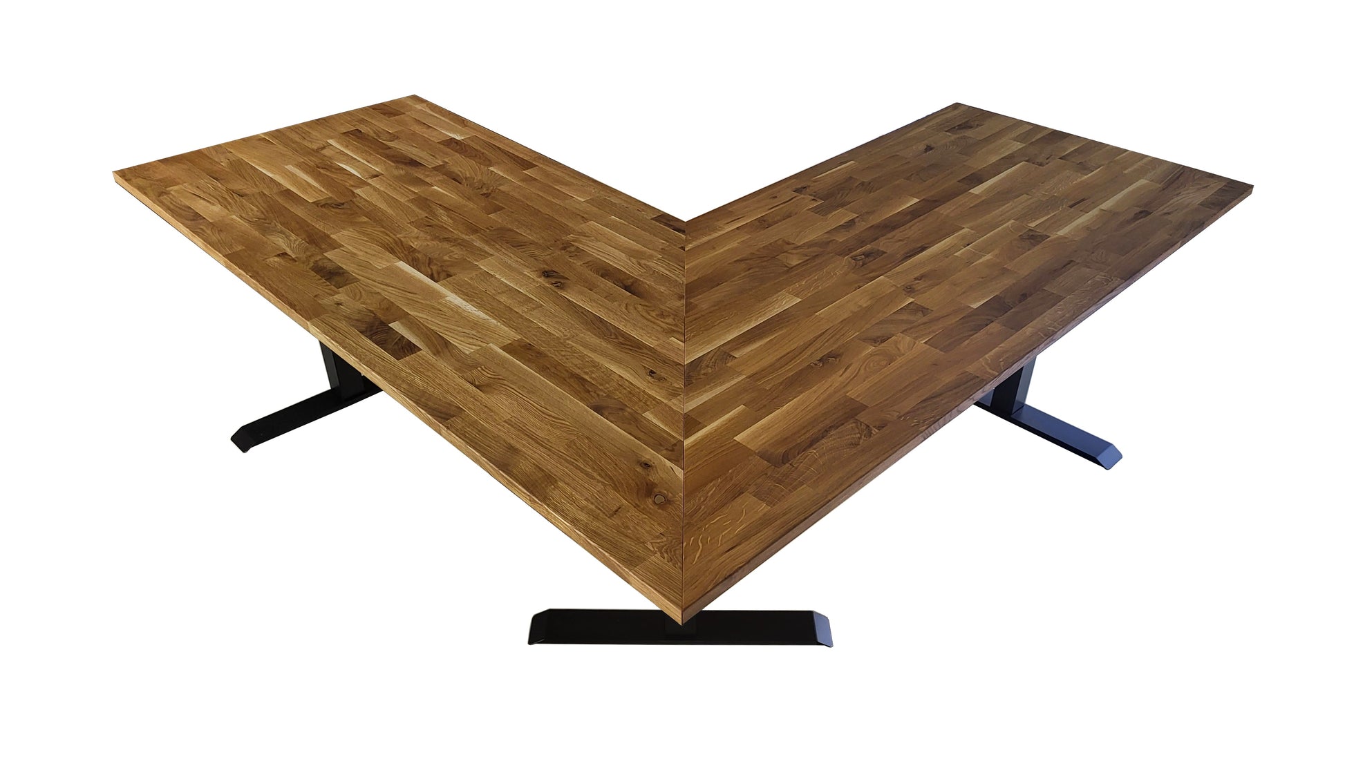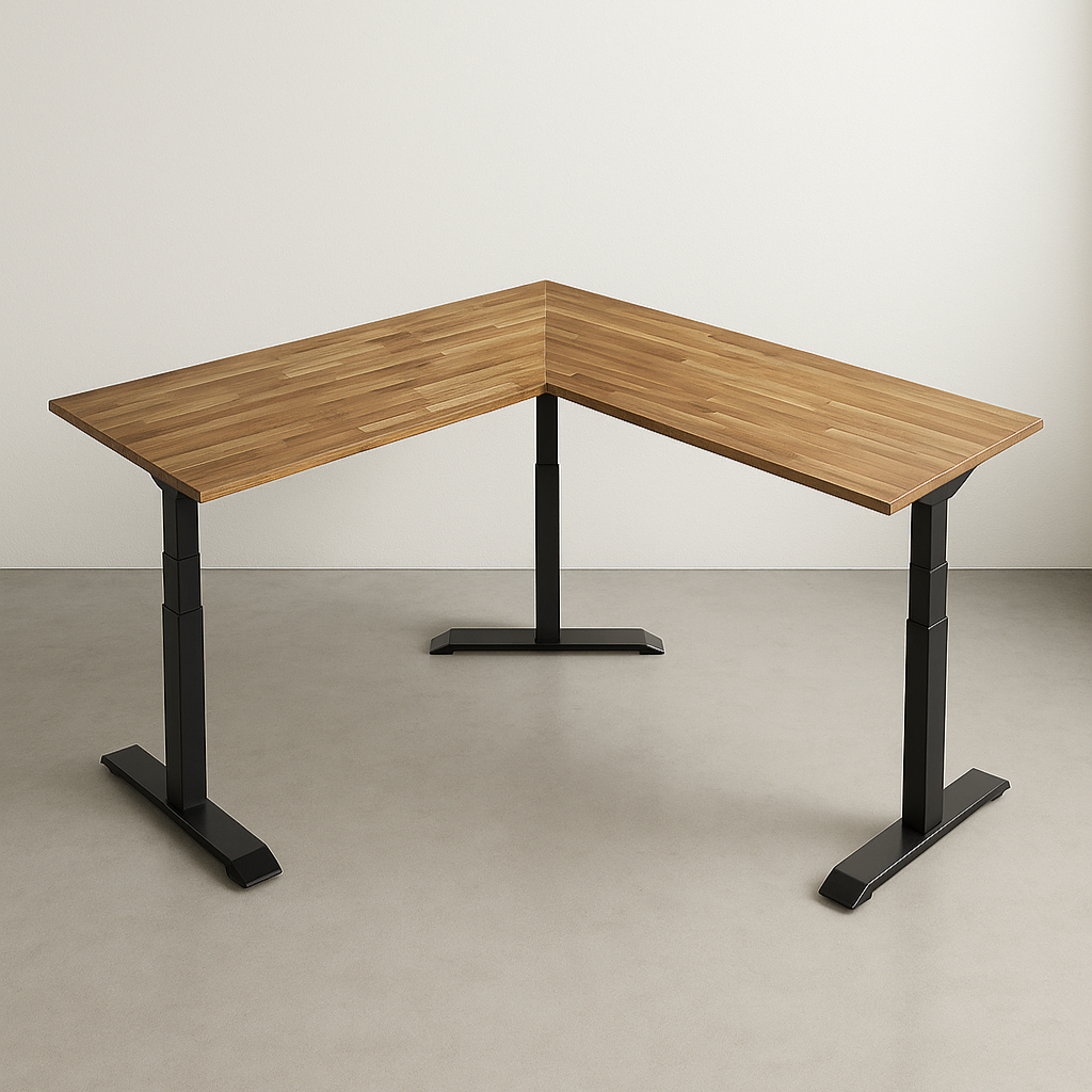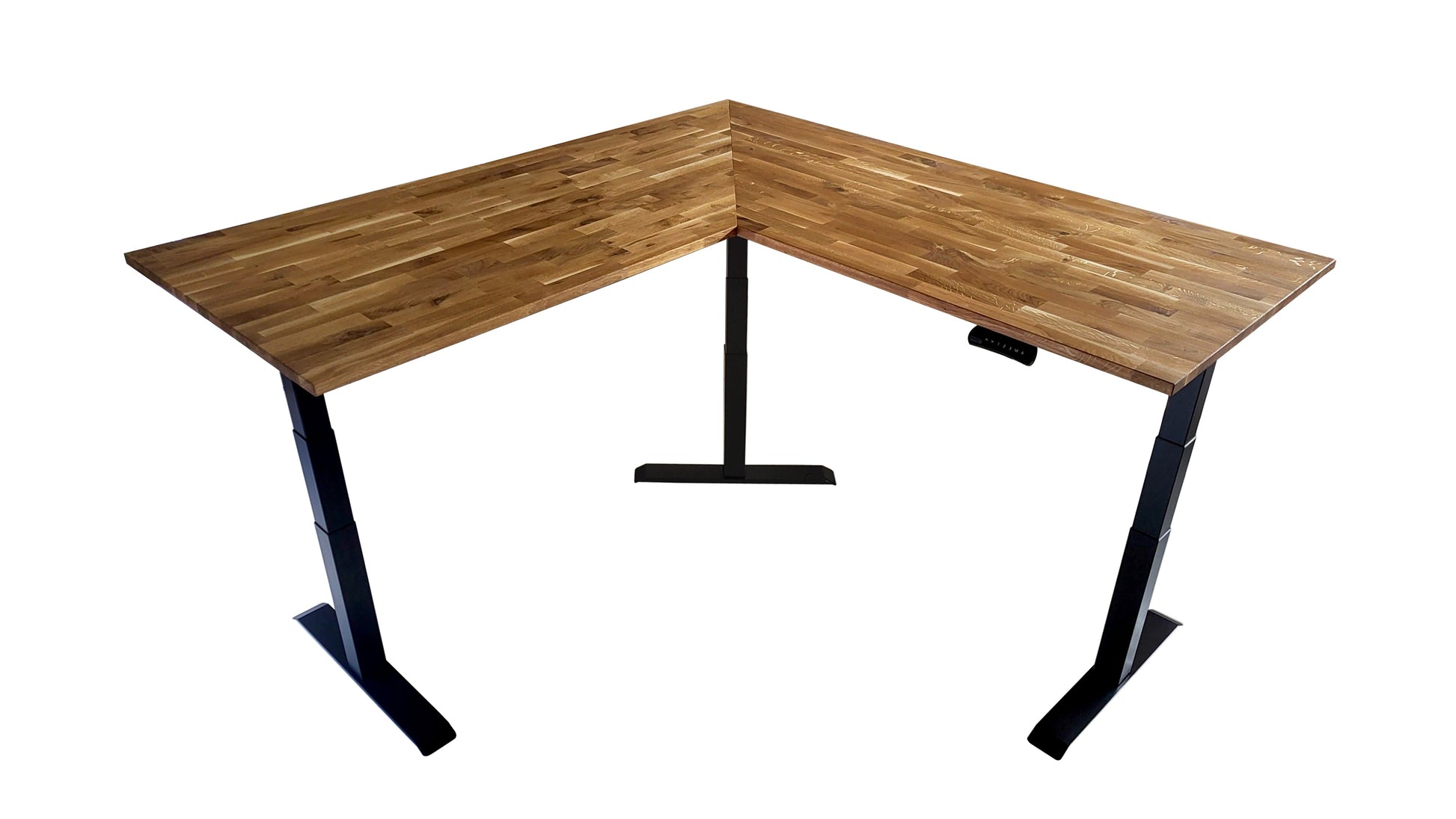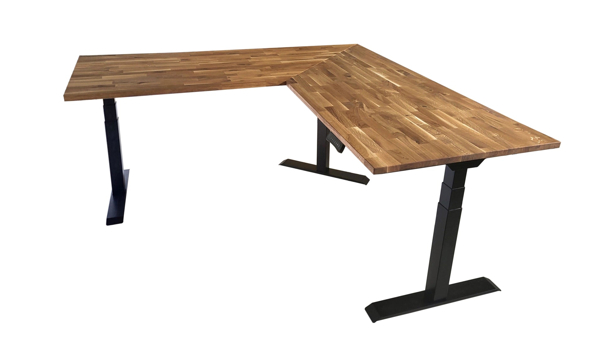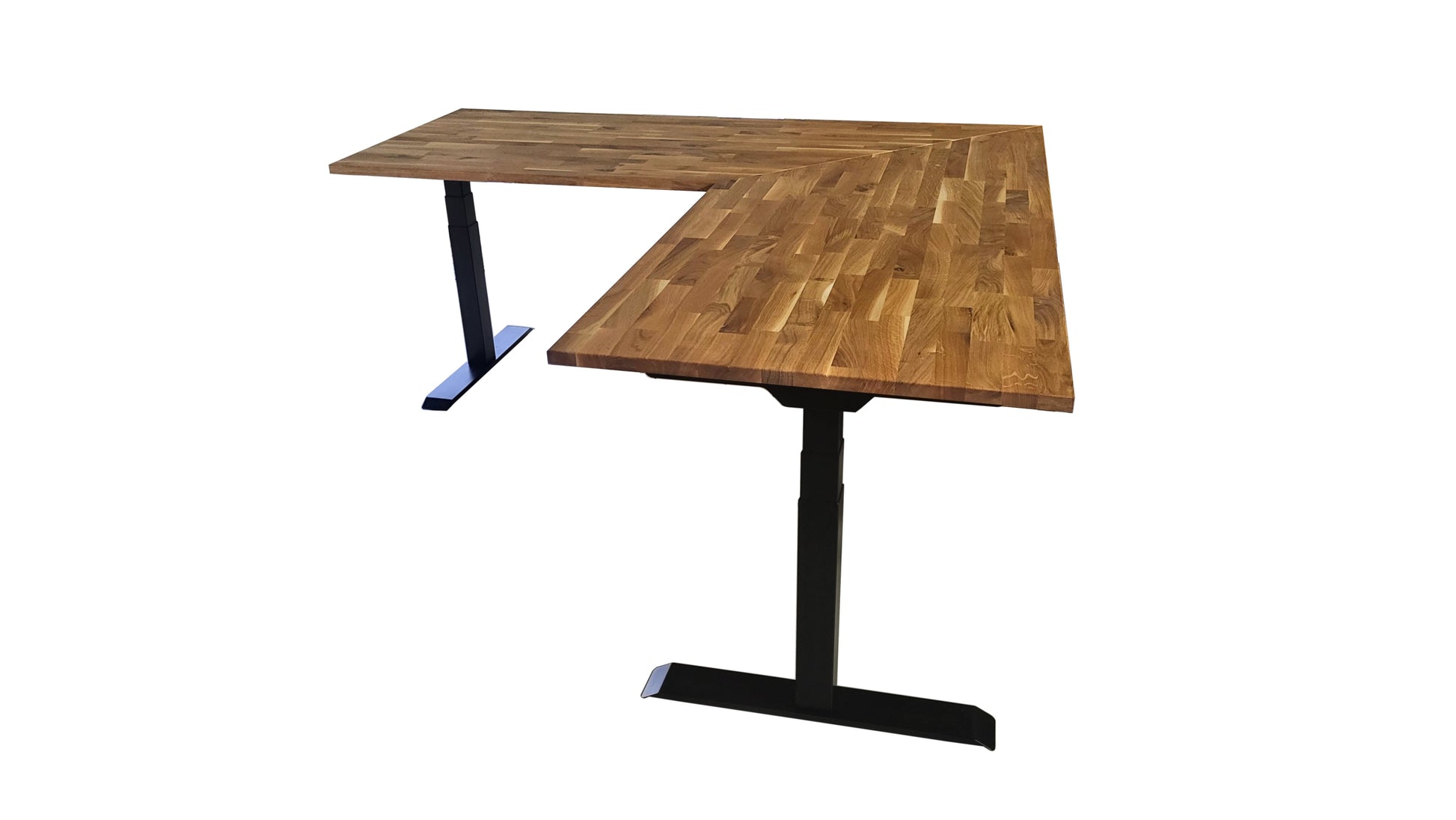 Dieses Unikat kann in unzähligen Varianten konfiguriert werden. Sie haben die Wahl zwischen 90, 120 oder 180 Grad. Der Eckschreibtisch besteht aus zwei separaten Holzplatten und kann daher in verschiedenen Längen gewählt werden. Die Konstruktion mit 3 Beinen und Motoren macht den Schreibtisch erstaunlich stabil: Die Belastbarkeit beträgt 150 kg. Kontaktieren Sie uns hier per E-Mail oder WhatsApp und teilen Sie uns Ihre Wünsche mit. Wir machen Ihnen eine Skizze, damit Sie sich Ihren neuen Schreibtisch besser vorstellen können.